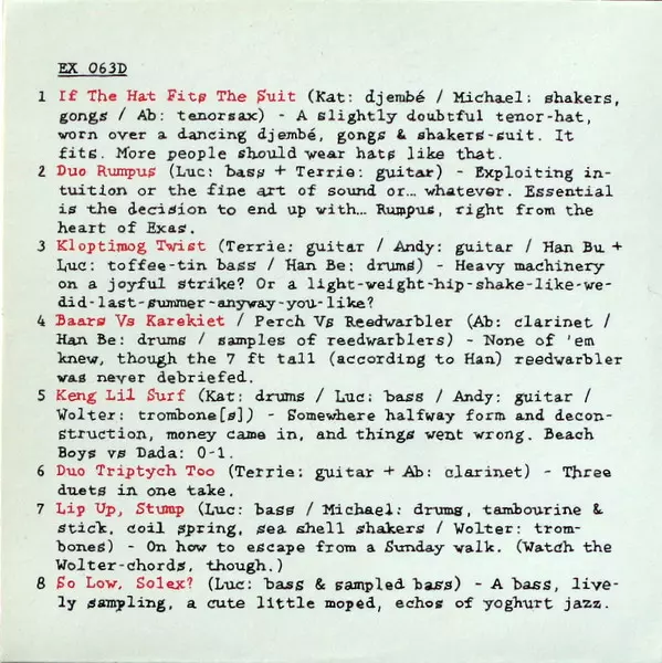 Acoustic Guitar [With Stopping-knife] Andy Ex | Drums Michael Vatcher | Guitar, Performer [Hummonica] Han Buhrs | Organ Terrie Ex | Performer [Stopping-knife On Acoustic Guitar] Katrin Ex