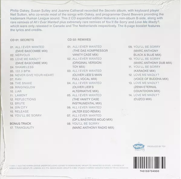 The Human League: Secrets DLX A lemezen lévő változat 2CD - deluxe kiadás. Ez a különleges kiadás - Európa a kiadó által Edsel Records év 1. szeptember 2023. Album műfajok között Elektronikus zene és Synth-Pop.