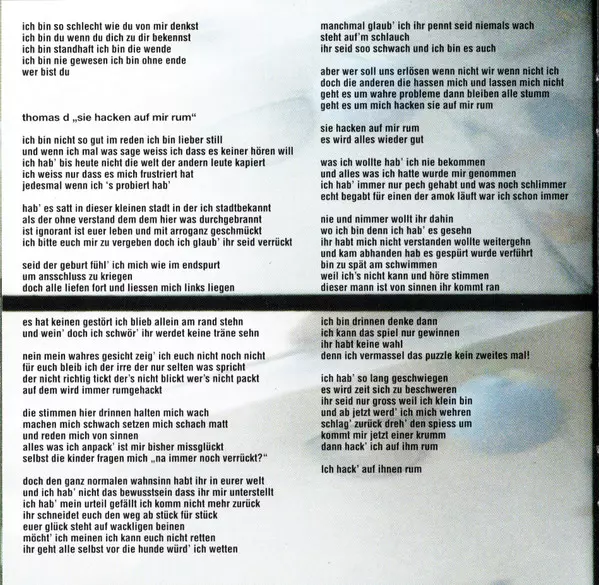 | Lyrics By [Text] Nils Bokelberg, Thomas Dürr | Music By Axel Hilgenstöhler, Claus Grabke, Jan-Hendrik Meyer, Jens Gößling, Steffen Wilmking | Producer Thomas D | Recorded By Uwe Sabirowsky | Recorded By, Mixed By Klaus Scharff | |||