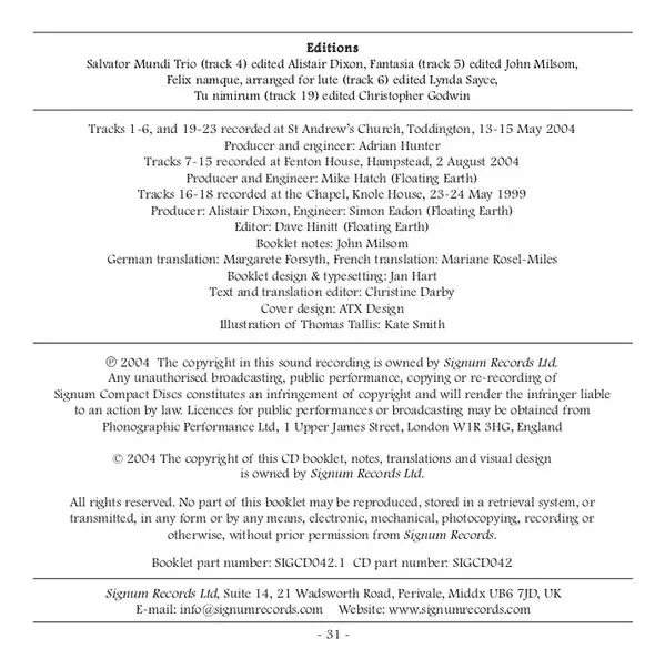 Művész | Laurence Cummings | Thomas Tallis | Charivari Agréable | Lynda Sayce | Stephen Taylor | Andrew Benson-Wilson |