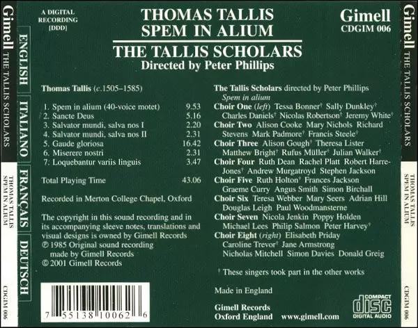 | Művész | Thomas Tallis | The Tallis Scholars | Peter Phillips |