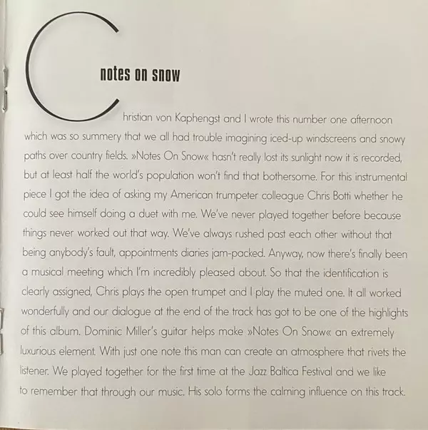 Acoustic Bass Christian Von Kaphengst | Drums Wolfgang Haffner | Featuring, Acoustic Guitar, Soloist, Electric Guitar Dominic Miller | Featuring, Trumpet Chris Botti | Guitar Markus Wienstroer | Percussion Roland Peil | Piano, Electric Piano Frank Chastenier | Trumpet, Programmed By Till Brönner | Written-By Christian Von Kaphengst, Till Brönner