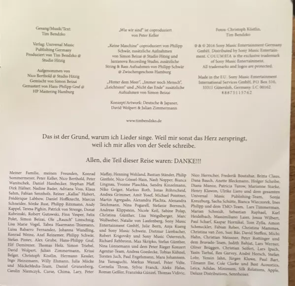 Acoustic Guitar Peter Keller, Tim Bendzko | Backing Vocals [Additional] Philipp Ritzmann | Bass Stephan Pfaff | Cello Frederique Labbow | Co-producer Peter Keller | Drums, Percussion Peter Wanitschek | Grand Piano, Piano Daniel Hassbecker | Viola Tabea Haarmann-Thiemann | Violin [1st] Lisa Marie Vogel | Violin [2nd] Johanna Wundling | Violoncello Luisa Marie Babarro Fernández