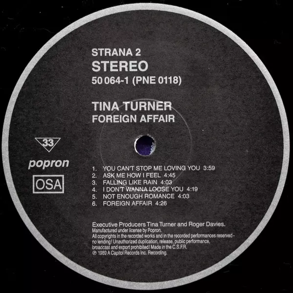 Tina Turner: Foreign Affair A lemezen lévő változat bakelitlemez LP - standard kiadás. Ez a különleges kiadás - Csehszlovákia a kiadó által Popron a következőkkel együttműködve Capitol Records.