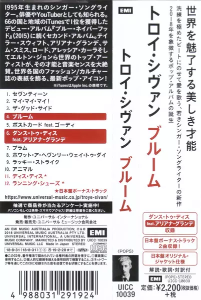 Troye Sivan: Bloom A lemezen lévő változat CD - standard kiadás. Ez a különleges kiadás - Japán a kiadó által EMI év 31. augusztus 2018.