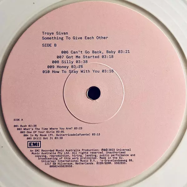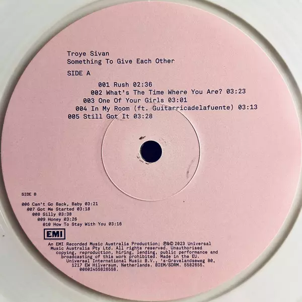 Troye Sivan: Something To Give Each Other CLR | LTD A lemezen lévő változat bakelitlemez LP - színes korlátozott példányszámban kiadás. Ez a különleges kiadás - Európa a kiadó által EMI év 20. október 2023. Album műfajok között Pop, Elektronikus zene, Ballada, Downtempo, House, Dance-pop, Contemporary R&B, Breaks, Alternative Pop, Alternative R&B és Alt-Pop.