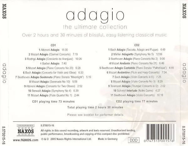 Various: Adagio The Ultimate Collection A lemezen lévő változat 2CD - standard kiadás. Ez a különleges kiadás - Németország a kiadó által Naxos év 14. május 2009. Album műfajok között Klasszikus zene, Barokk zene, Románcok és Könnyűzene.