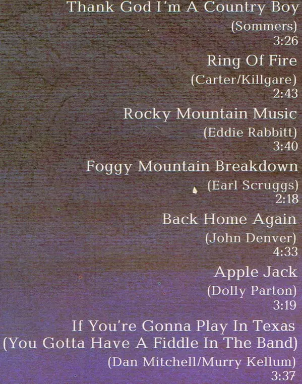 A7 | M. Jones Band: If You're Gonna Play In Texas (You Gotta Have A Fiddle In The Band) | 3:37 min | |