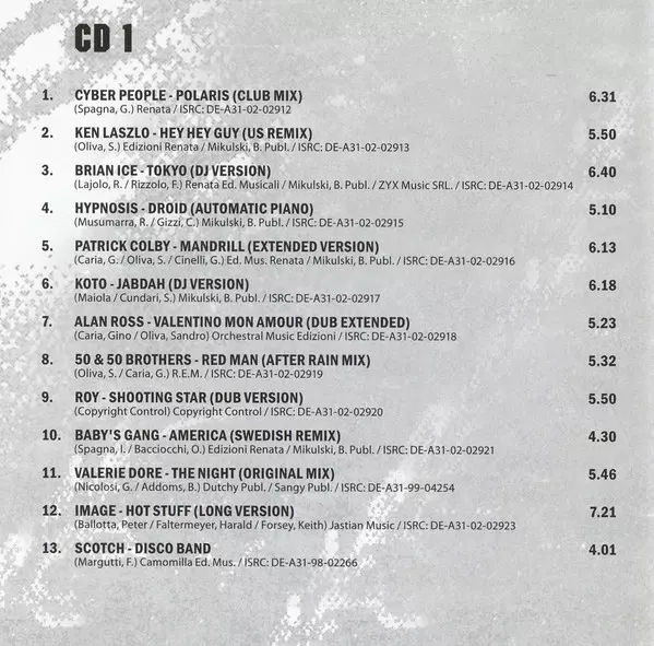Namen wie Cyber People, Ken Laszlo, Hypnosis, Koto, Baby's Gang, Valerie Dore, J. D. Jaber, Phil Grant lassen Erinnerungen wach werden. Hier kommen lauter Originale des Wegs. 3CD set full of the biggest hits of the time in original mixes and with a tracklist that features all the biggest stars of the time including Ken Laszlo, Valerie Dore, Koto...