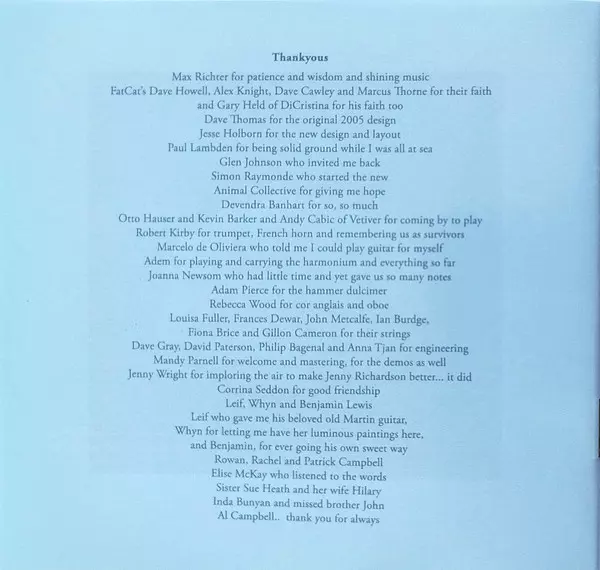 Arranged By Max Richter, Vashti Bunyan | Electric Piano [Fender Rhodes], Instruments [Pneumonium] Max Richter | Guitar Marcelo de Oliviera | Harp Joanna Newsom | Vocals Vashti Bunyan