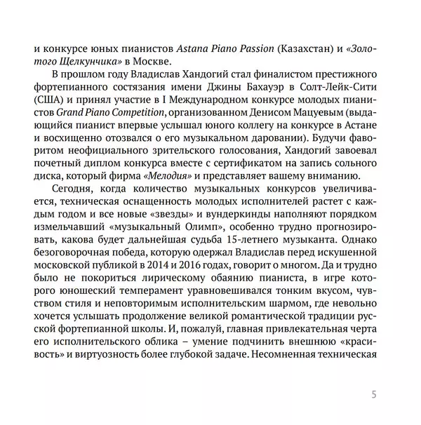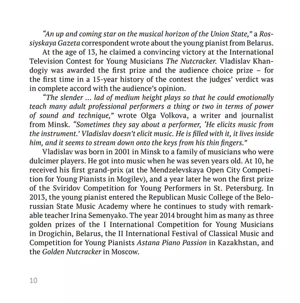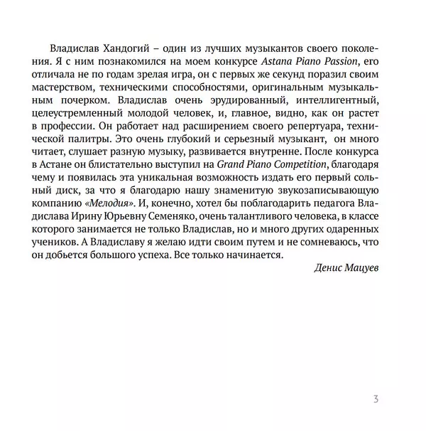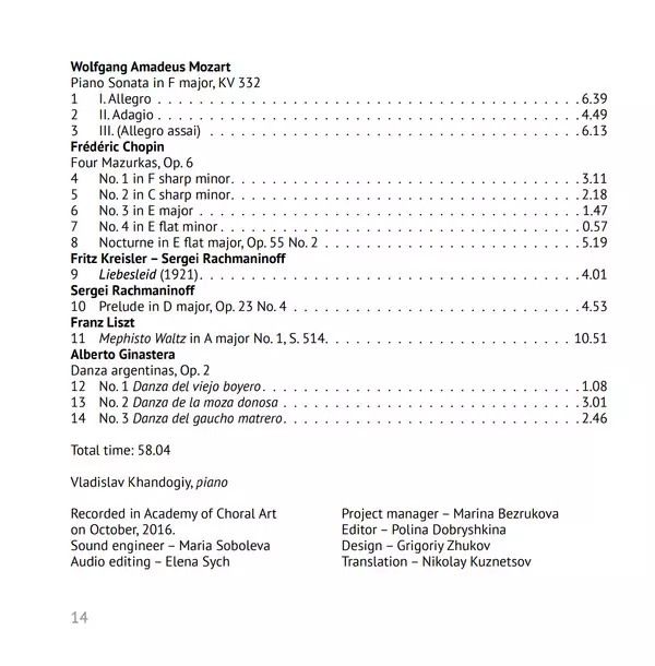 | Művész | Wolfgang Amadeus Mozart | Frédéric Chopin | Sergei Vasilyevich Rachmaninoff | Franz Liszt | Alberto Ginastera | Fritz Kreisler | Vladislav Khandogiy |