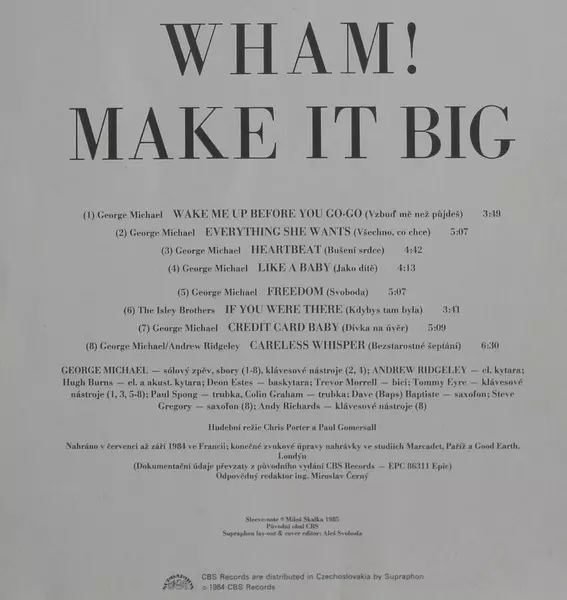 Wham! The album Make It Big, released in 1984, features upbeat pop and dance tracks. The album was a commercial success, reaching number one in the UK and selling over six million copies worldwide. The album spawned several hit singles, including "Wake Me Up Before You Go-Go" and "Careless Whisper".