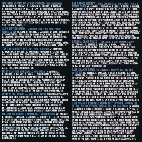 | DAW [ProTools] Billy Hume, Young Guru | Featuring Fat Joe, Juvenile (2), Lil' Jon, Murphy Lee | Mixed By Ray Seay, Young Guru | Producer Lil' Jon | Recorded By Jonathan Cantrell (2), Young Guru | Written-By Craig Love, D'eongelo Holmes, Eric Jackson (3), Jonathan Smith, Joseph Cartagena, LaMarquis Jefferson, Terius Gray, Tohri Harper | |||