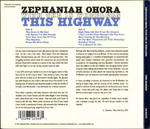Zephaniah OHora: This Highway A lemezen lévő változat CD - standard kiadás. Ez a különleges kiadás - USA a kiadó által Last Roundup Records év 9. június 2017. Album műfajok között Folk, World, & Country és Country.