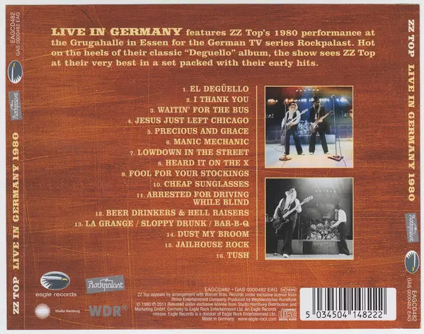 "Live In Germany" was recorded in 1980 at the Grugahalle in Essen for the TV series Rockpalast. The concert, which took place immediately after the release of their classic album "Deguello" (its songs were classified accordingly), shows why ZZ Top was nicknamed "The Lil' Ol' Blues Band from Texas" in the days before sequencers and synthesizers. ...
